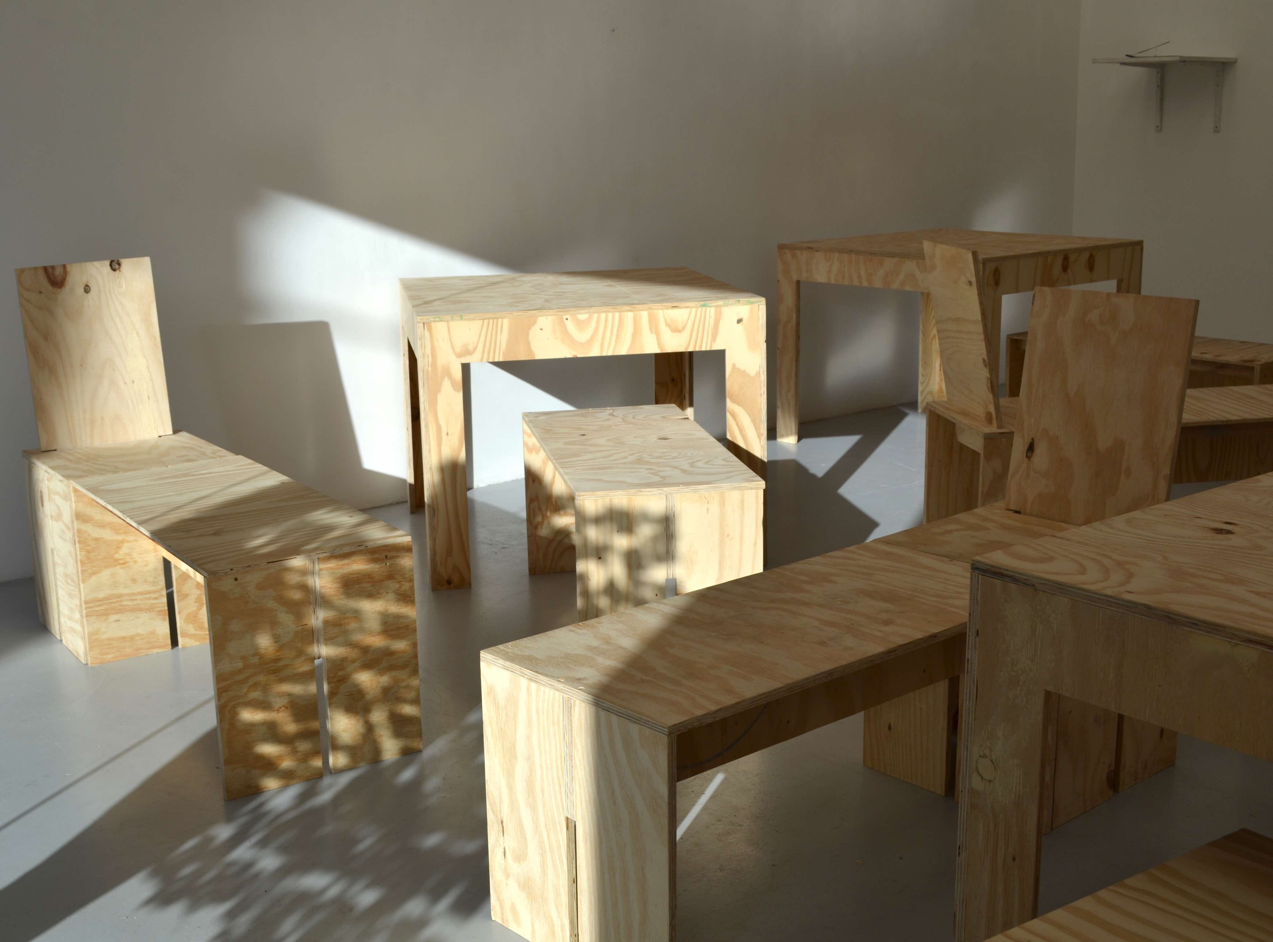 A set of 4 tables, 8 benches and 4 chairs made for the exhibition Duration at APT gallery in London. The elements are modular and can be assembled to serve as different designs: a bar, loungers or just as benches and tables.